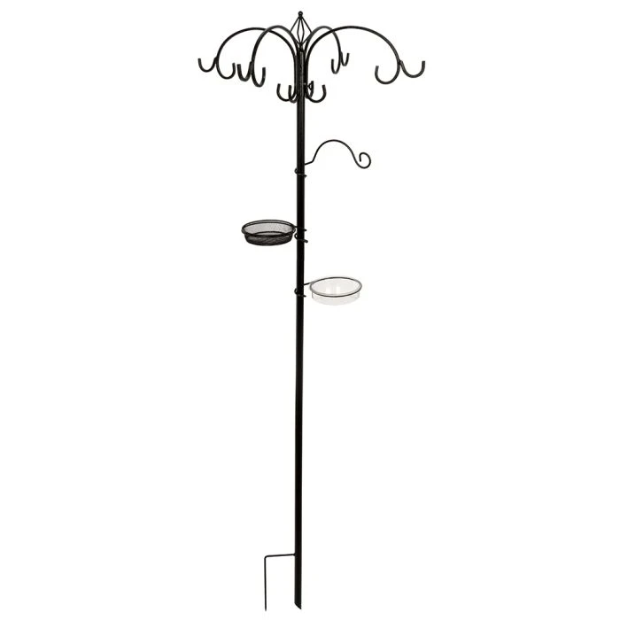 This feeding system consists of 4 arms with 2 hooks at the end of each arm to hang different types of feeders. Lower on the pole you can attach an extra hook to offer smaller treats as well as another two dishes. One dish is suitable for offering a feed mix or mealworms and the other dish is for water.