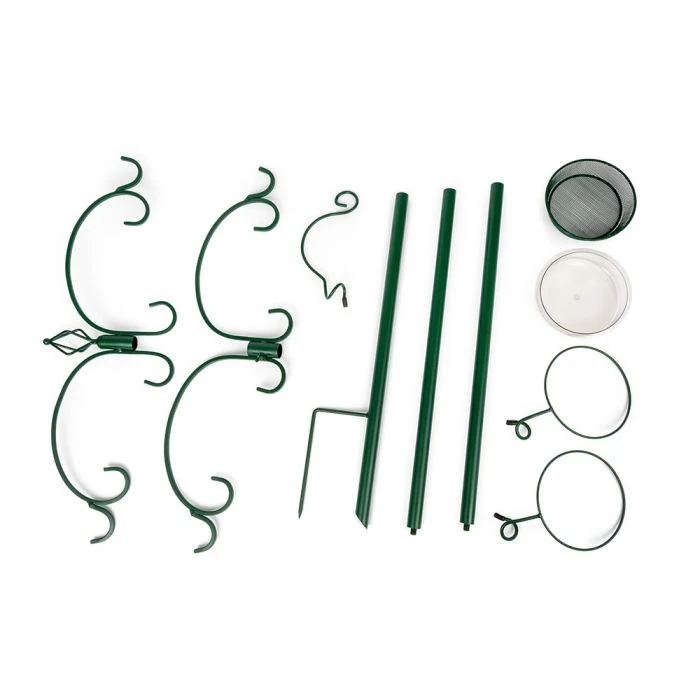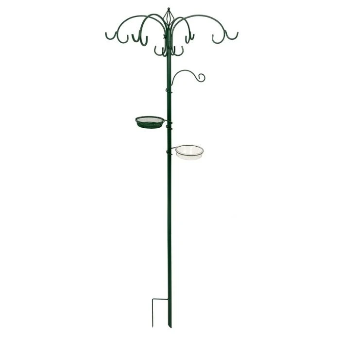 This feeding system consists of 4 arms with 2 hooks at the end of each arm to hang different types of feeders. Lower on the pole you can attach an extra hook to offer smaller treats as well as another two dishes. One dish is suitable for offering a feed mix or mealworms and the other dish is for water.