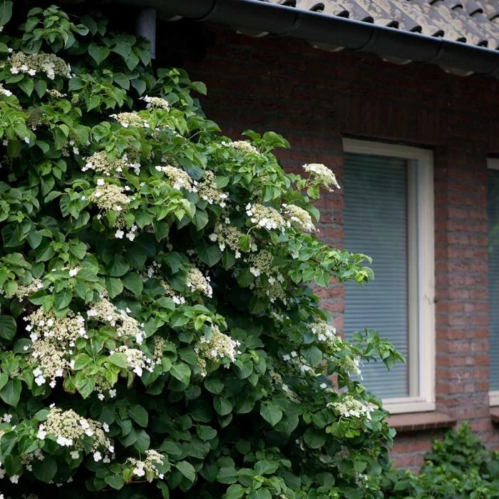 This Climbing Hydrangea blooms with large white flowers and the dense foliage is a great place for birds, such as Blackbirds, to build their nests.