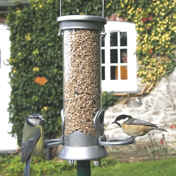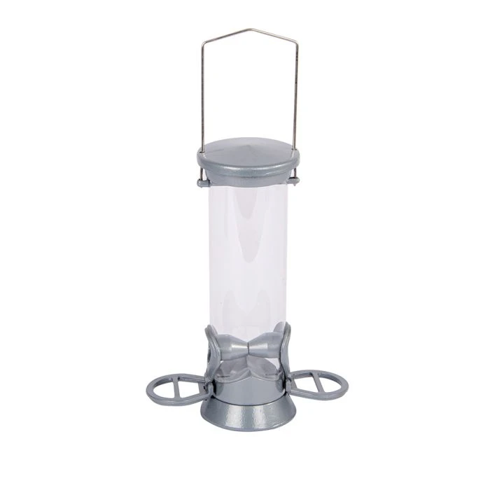 This small but strong feeder is perfect for feeding your garden birds delicious and nutritional bird seed. The Defender feeder has an easy flow base, tough hanger and cap – all constructed from corrosion resistant solid metal alloy. Seed feeder tubes are made from UV-stabilised polycarbonate, which will not deteriorate or fade when exposed to sunlight. Each component has been ergonomically designed, providing excellent performance benefits and ease of use. The feeders also completely dismantle for cleaning. The feeder has a screw thread in the base making it compatible with many of our feeder accessories including feeder trays, which are great for collecting any waste material from the feeder as well as acting as an additional feeding and perching area for your garden birds.