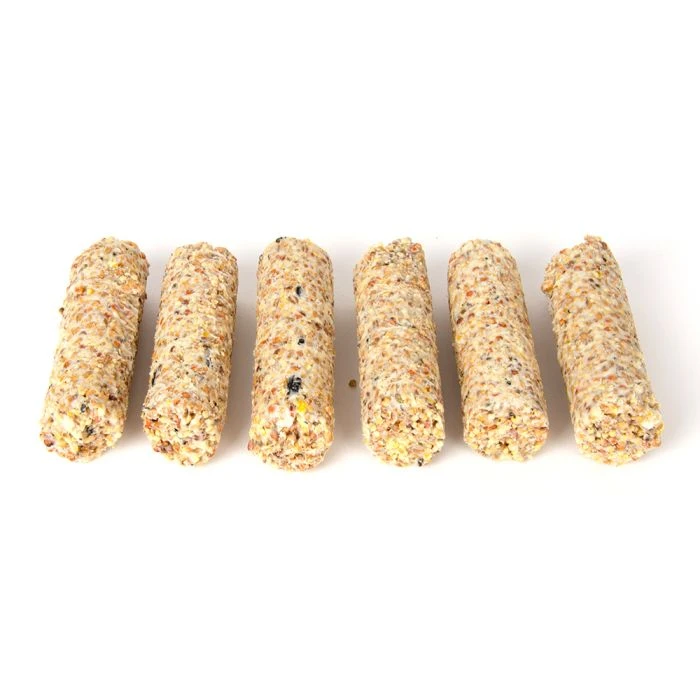 These suet logs are made from fat and peanut flour and are packed with mixed grains and oil-rich seeds, so there’s something to attract both fat and seed-eating birds. You can place the rolls on a bird table or use our specially designed suet log feeders. We are sure your garden birds will flock to enjoy this nutritious treat!