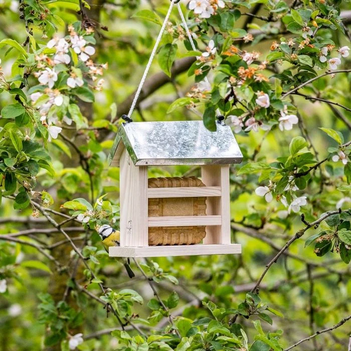 The Turku Peanut Cake Feeder has a beautiful design, resembling a quaint house. It is easy to use with a fat block. just slide the metal roof up via the suspension cable. The wooden suet block holder has a pale white finish and an elegant metal roof. Give it a nice place in the garden, then sit back and enjoy as the birds flock to it. Energy-rich food is very important for birds in the Winter. This keeps them active and warmer for longer on cold nights.
